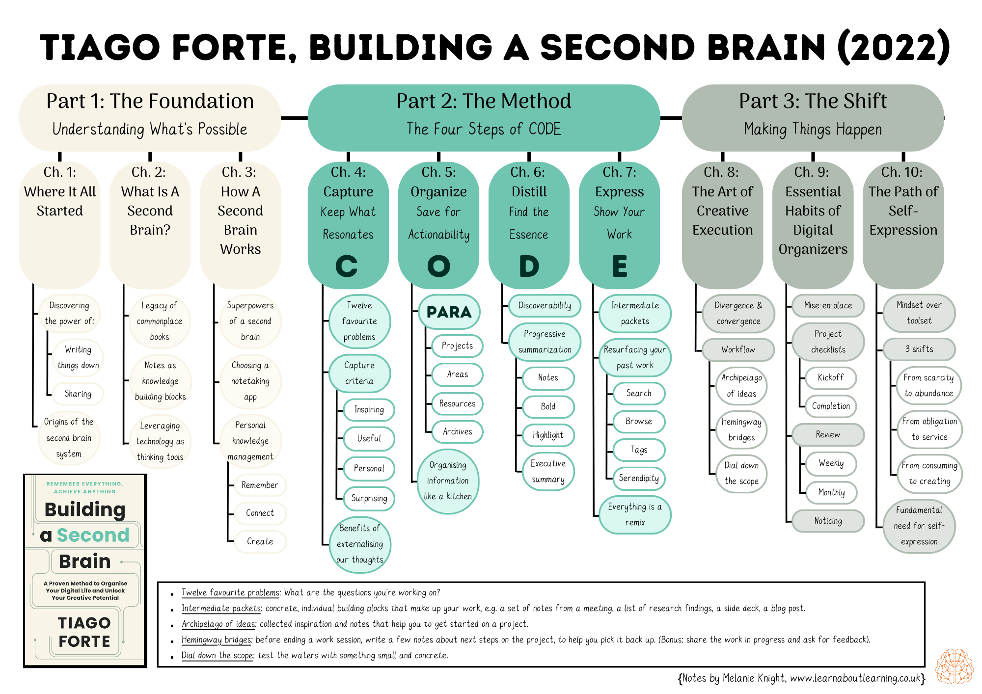 I create structural summaries of some books that I read, to help me to see how ideas fit together across chapters. These were created in Canva and Miro. The summary of Building a Second Brain has been shared by the author in his newsletter and by Francis Miller in an article.
